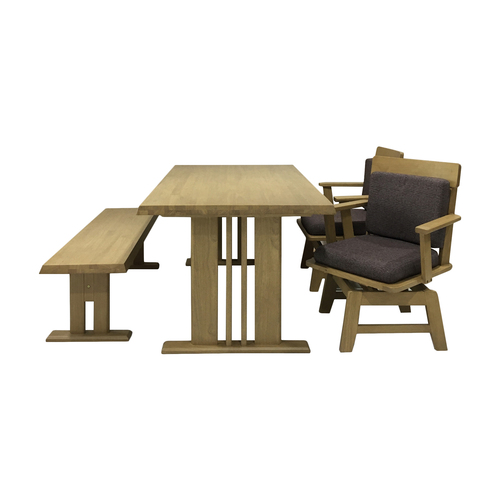 幅150cmのゆったりサイズのテ-ブルに回転式チェア2脚とベンチがついた4点セット