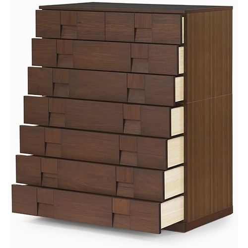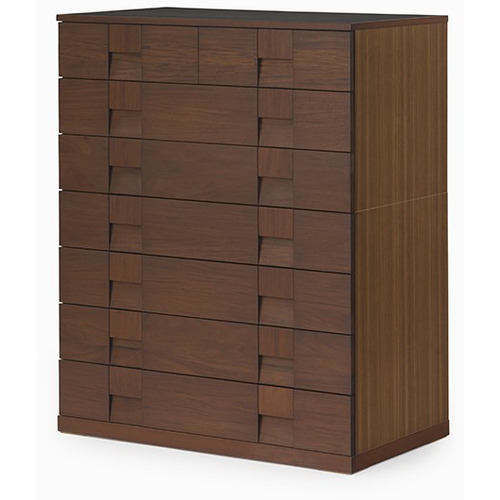 最大の魅力は、前板全てを稀少な高級材「ブビンガ材」の無垢材で仕上げていること。ブビンガ材の柾目はとても美しく、天然木本来の質感を最大限に感じられます。内部には上質な桐材を使用。桐は調湿性があり、大切な衣類も安心して収納できます。耐久性や密閉性に優れ衣類の収納に最適です。最上段の小引き出しは、それぞれ収納に便利な仕切り付き。上下で分割でき充実した機能性です。一見個性的な表情ですが、無駄のないシンプルなデザインなのでお部屋をすっきりみせ、様々なお部屋の雰囲気に合わせていただけます。明るく落ち着きのあるウォールナット色です。 【仕様】