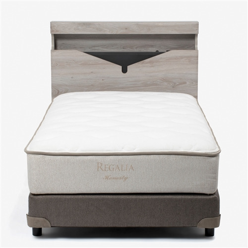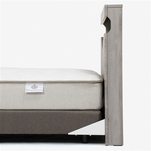 目覚まし時計やティッシュなどが置ける宮付きのヘッドボード。宮付きのヘッドボードは厚さは約12cmしかありませんので、お部屋のスペースを圧迫しません。LEDライトは中央のアクリルを通し、間接照明のようなやさしい光を届けます。宮の収納部にはコンセントとUSBコンセントが内蔵されています。
