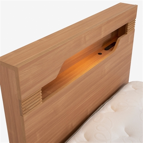 LED照明付きのヘッドボードには収納スペースがあり、眼鏡などのちょっとしたものの収納に便利です。1口コンセントと充電用のUSBポートが1つあります。