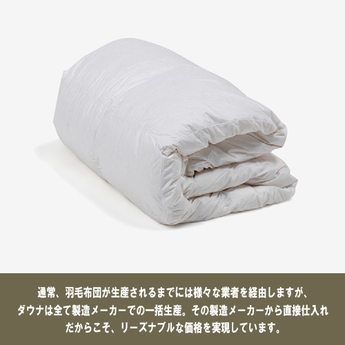 通常、羽毛布団が生産されるまでには様々な業者を経由しますが、「ダウナ」を扱う製造メーカーは全て一括生産。直接仕入れられるからこそリーズナブルな価格を実現。