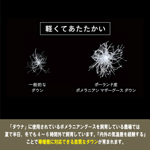 ダウナには主にポーランド北部ポモージェ地方で飼育されている「ポメラニアングース」という品種が使用されています。ポモージェ地方は昼と夜、そして夏と冬の寒暖差が激しく、1月の平均気温は?10℃、一年のうち20日前後は?20℃以下の極寒の日があります。耐寒性のあるポメラニアングースは、この厳しい自然環境に順応し、強固な羽枝を持つ特別に大きく成熟したダウンを持っています。一般的なグースが小屋の中で飼育されることが多いなか、「ダウナ」に使用されているポメラニアングースを飼育している農場では夏で半日、冬でも4?6時間外で飼育しています。『内外の気温差を経験する』ことで寒暖差に対応できる良質なダウンが育まれます。