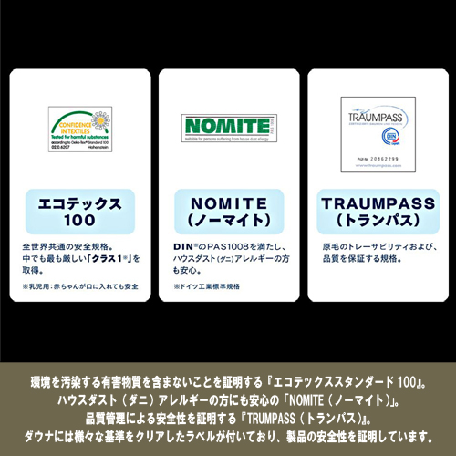 環境を汚染する有害物質を含まないことを証明する『エコテックススタンダード100』、ハウスダスト(ダニ)アレルギーの方にも安心の「NOMITE(ノーマイト)」、品質管理による安全性を証明する『TRUMPASS(トランパス)』。