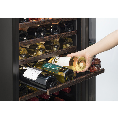 ウッドブラウンの外観とよくマッチした木製飾り付きスライド式ワイヤーラックを標準装備。ワインボトルを手前と奥の二列配列とし、コンパクトなサイズに比して余裕のある収容本数を確保。スライド式ラックは、半分まで引き出せるようにし、安全性を確保しながらも奥のワインボトルが取り出しやすい設計にしました。