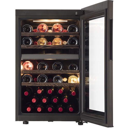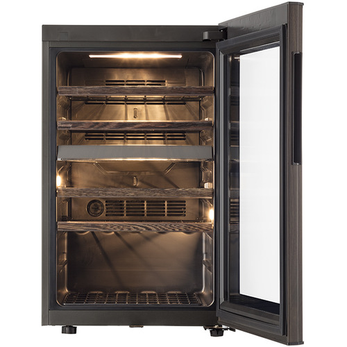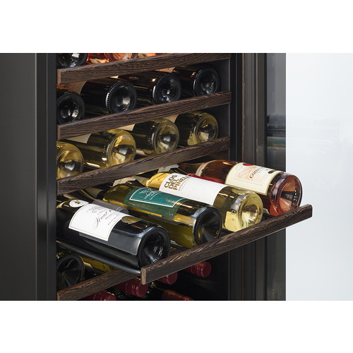 ウッドブラウンの外観とよくマッチした木製飾り付きスライド式ワイヤーラックを標準装備。ワインボトルを手前と奥の二列配列とし、コンパクトなサイズに比して余裕のある収容本数を確保。スライド式ラックは、半分まで引き出せるようにし、安全性を確保しながらも奥のワインボトルが取り出しやすい設計にしました。