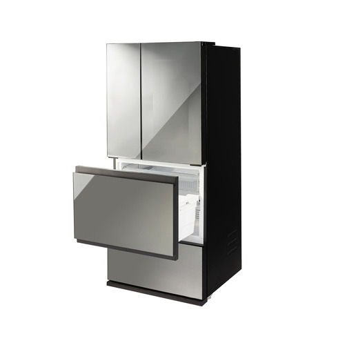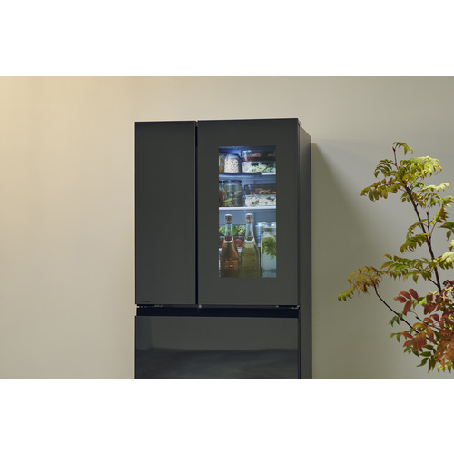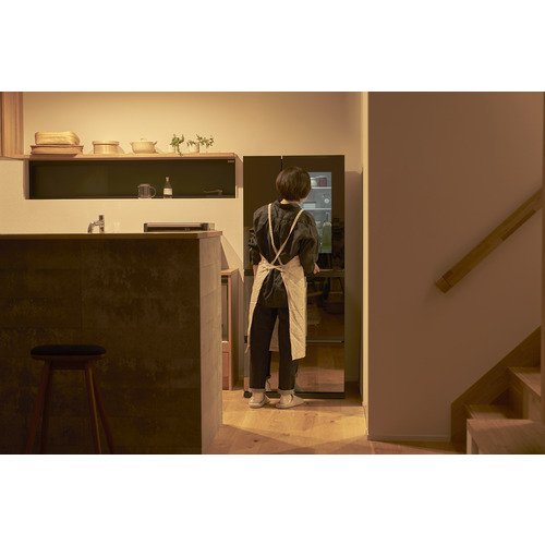 ドアについたセンサーに軽く触れると、ハーフミラーが透けて、開けずに庫内が確認できます。