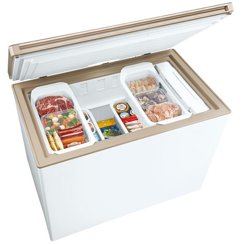 AQUAだけのファン式チェストタイプだから霜取り不要! 可動式バスケット収納だから食材の出し入れがしやすい。