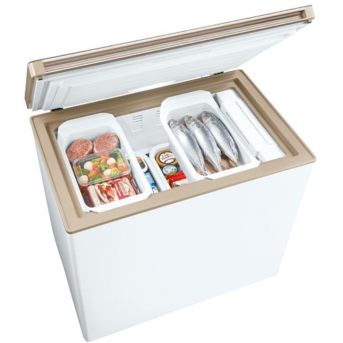 AQUAだけのファン式チェストタイプだから霜取り不要! 可動式バスケット収納だから食材の出し入れがしやすい。