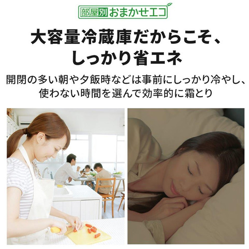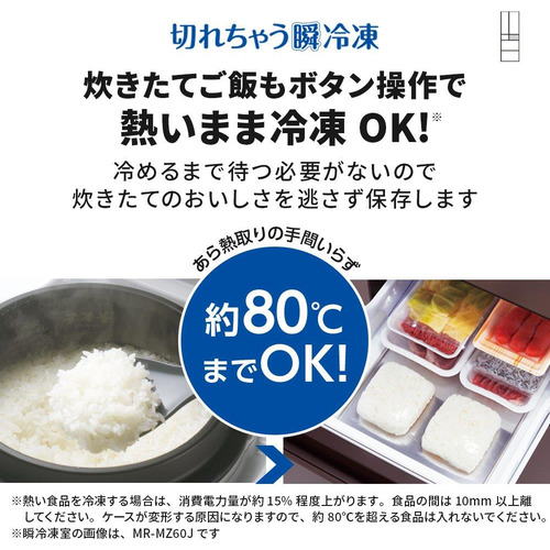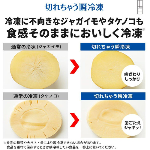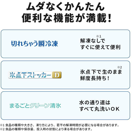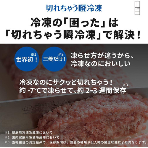 冷凍なのにサクッと切れて、しかもおいしい「切れちゃう瞬冷凍」。約-7℃で凍らせる独自の技術で解凍の手間を省き、必要な時に必要な分だけ使えるので、調理時間の短縮に貢献。食品のムダも抑制。食品全体に一瞬で氷核を形成し均一に凍結する冷凍技術で、細胞破壊を抑え、解凍しても食感やうまみ成分を維持。冷凍に不向きな食品もおいしく保存。食品を2〜3週間保存できるので、冷凍室(1か月以上)と使い分けることで、食品をよりおいしく最適な状態で保存可能。炊き立てごはんも、ボタン操作一つで熱いまま冷凍OK。炊きたてのおいしさを逃さず自動で急冷。解凍しても、もちもちの食感を味わえる。肉や魚を凍らせず、おいしく長く保存。生だから毎日の調理もとってもラク!「氷点下ストッカーD」。肉や魚を冷凍しないで長くストック。チルドや冷蔵室より低温の約−3℃〜0℃で保存するので、鮮度が長持ち。しかも氷点下なのに凍らない過冷却現象を応用した技術で、生鮮食品をまとめ買いして生のままおいしく保存できる。冷凍した食材も、おいしく解凍!冷凍した食材を朝、氷点下ストッカールームに入れておけば、夕方にはドリップを抑えておいしく解凍できる。解凍開始から約90分で包丁で切れる硬さまで解凍可能。翌日以降もおいしく使える。