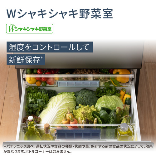 野菜室:〈仕様〉・ワンダフルオープン(ベアリング式高耐荷重レール)・Wシャキシャキ野菜室 (Wモイスチャーコントロールフィルターつき) ・ボトルサポーター ・2Lペットボトル収納量:10本
