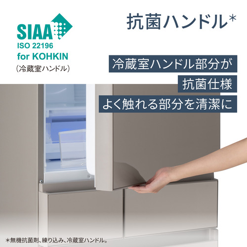 機能:・AIエコナビ(かしこく・しらべる) ・抗菌ハンドル(冷蔵室ハンドル) ・除菌機能:全室ナノイーX(クリーンパトロール) ・脱臭機能:全室ナノイーX(クリーンパトロール)、Agバイオ抗菌脱臭