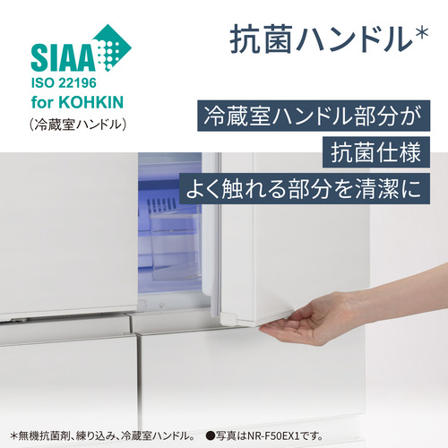 ●「ナノイーX」搭載で、庫内を清潔に保てる両開きタイプ。解凍いらずの「微凍結パーシャル」で鮮度長持ち(※運転状況や食品の種類・状態や量によって、効果が異なります。※)(※試験依頼先:(株)テクノサイエンス●試験方法:周囲温度25℃、設定温度 パーシャル「中」設定とチルド設定●保鮮の対象部分:パーシャル室●対象食品:豚ロース肉、豚バラ肉、包装状態 ラップ●試験結果:14日保存後の生菌数が10^7未満●試験番号:豚ロース肉(成績書No.19021688-002)、豚バラ肉(成績書No.19021738-002)●対象食品: 鶏もも肉、牛ミンチ肉、鶏ミンチ肉、加熱後の作り置き食品(カレー、ミートソース、肉じゃが、ひじきの煮物、きんぴらごぼう)、加熱前の下ごしらえした食品(ハンバーグ)、包装状態 肉とハンバーグはラップ/それ以外は密閉容器●試験結果:10日保存後の生菌数が10^7未満●試験番号:鶏もも肉(成績書No. 19021723-002)、牛ミンチ肉(成績書No. 19021669-002)、鶏ミンチ肉(成績書No. 19021326-004)、加熱後の作り置き食品(成績書No.19021517-002)、加熱前の下ごしらえした食品(成績書No.20020516-002)●対象食品:イワシ一尾、包装状態 市販トレイ(ラップ)●試験結果:7日保存後のイワシのK値(初期値11.3%)チルド設定33.7%、パーシャル設定17.7%で、約16%抑制。●K値とは主に魚の鮮度を表す指標です。値が低いほど鮮度が良く、一般に20%以下ではお刺身などの生食が可能とされます。●運転状況や食品の種類・状態や量によって、効果が異なります。●賞味期限・消費期限を延ばす効果はありません。※)。