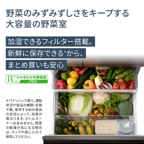 ●まとめ買いした野菜もたっぷり入る、野菜室が真ん中モデル。野菜をうるおい保存でき、約10日間新鮮長持ち(※当社調べ。運転状況や食品の種類・状態や量、保存する前の食品の状況によって、効果が異なります。ボトルコーナーは含みません。※)。