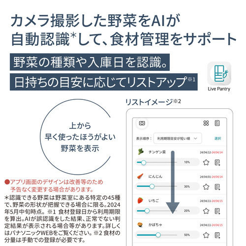 業界初(※国内家庭用冷凍冷蔵庫において。カメラで庫内の食材を画像認識し、日持ち目安に応じて「Live Pantry」アプリで早く使うべき野菜とそのレシピを提案する。認識できる野菜は野菜室にある特定の45種で、野菜の形状が把握できる場合に限る。2024年3月28日時点。2024年5月31日発売予定。※)、野菜室の野菜をカメラの画像(※マーカーを取り付けた上で、冷蔵室の両ドアを約90度以上、野菜室・冷凍室のドアを全開まで開けると撮影します。撮影画像には、ドアを開けた方や、居室の一部など冷蔵庫の周囲の様子が写り込む場合があります。食品の収納場所やドアを開ける角度により、カメラ撮影に写らない部分があります。アプリ閲覧用に切り出し加工されたカメラ画像は、当社サーバーに保存されます。詳しくはWEBをご覧ください。※)からAIが自動認識(※野菜室にある特定野菜のみ。自動認識できる食材数・種類はアップデートに伴い変化します。※)、日持ちの目安に応じてレシピを提案する機能を搭載(※食材登録日から利用期限目安を算出。