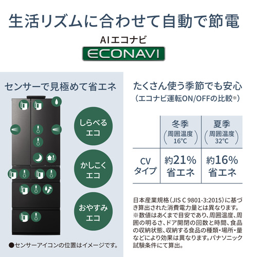 機能:・AIエコナビ(おやすみ・かしこく・しらべる) ・庫外湿度センサー ・抗菌ハンドル(冷蔵室ハンドル) ・ナノイーX(冷蔵室) ・Wクリーンフィルター ・無線LAN接続 ・専用アプリ「Live Pantry」対応 ・「冷蔵庫AIカメラ」搭載