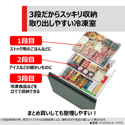 食品が積み重なりがちな冷凍室が3段のケースになっているので、細々とした食品などもすっきり収納できます。