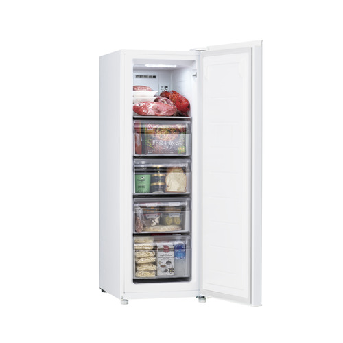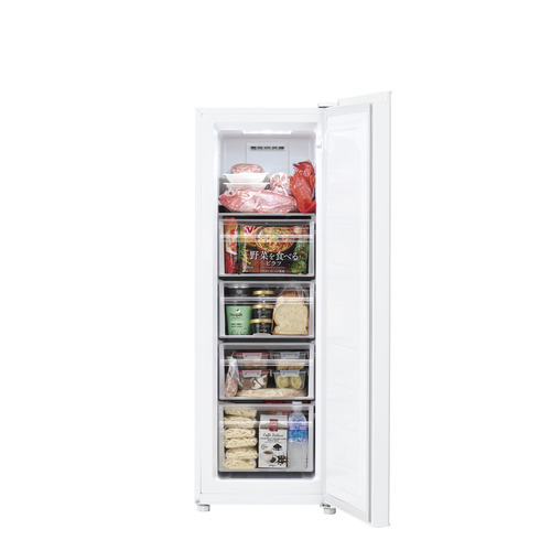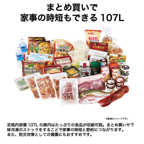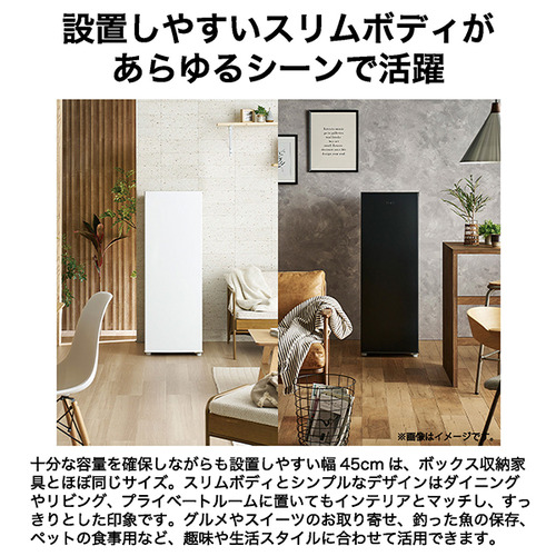 整理整頓や収納のしやすさにこだわり設計した庫内は107Lを確保。収納力や設置場所など使いやすさを追求した結果、45cmという幅になりました。限られた空間にも設置しやすいサイズと程よい収納力は、セカンド冷凍庫にぴったり。インテリアに合わせて選べるブラックとホワイトの2色展開です。