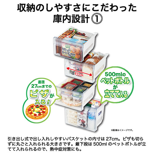 引き出し式で出し入れしやすいバスケットの内寸は27cm。ピザも切らずに丸ごと入れられる大きさです。最下段は500mlのペットボトルが立てて入れられるので、熱中症対策にも。