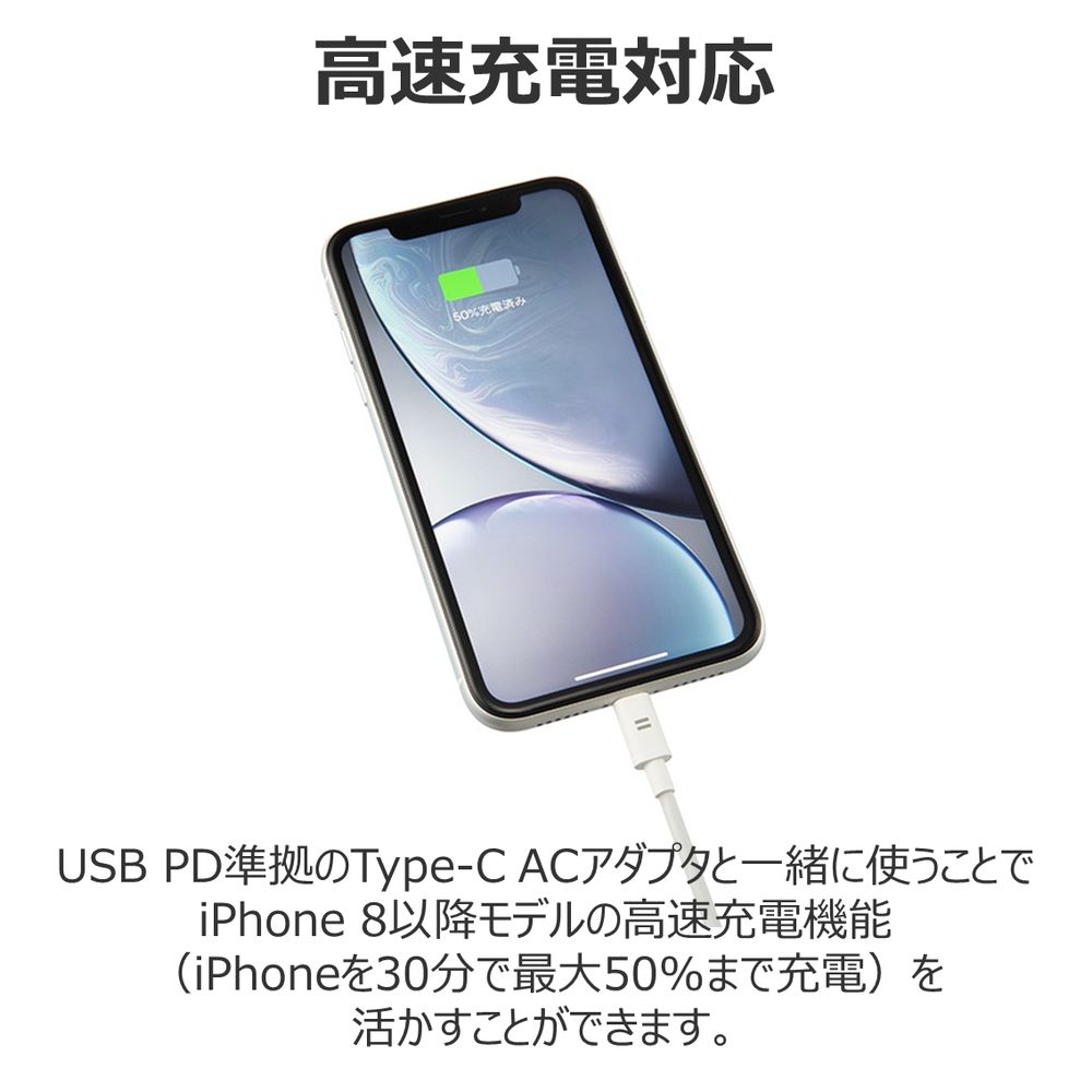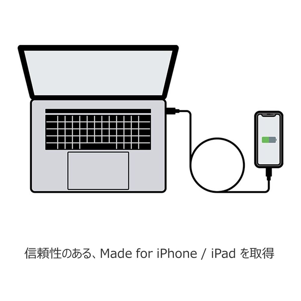 iPhone/iPadのLightningコネクタ搭載機器と、USB Type-CのACアダプタ・パソコンと繋いで充電・データ同期可能。対応ACアダプタを使う事で、iPhone 8以降で高速充電に対応。使いやすい1.2mのケーブルを採用。