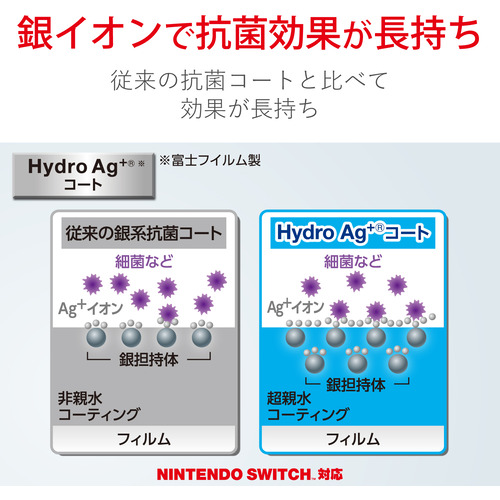 ●抗菌能力の高い富士フイルム特殊抗菌技術Hydro Ag+(R)コーティングを施した、液晶画面をキズや汚れから守る、抗菌・ブルーライトカットタイプのNINTENDO SWITCH(TM) 用液晶保護フィルムです。