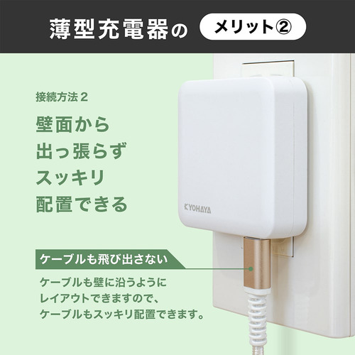 上下のコンセントを邪魔せずに使える薄型充電器の中でも極薄な厚さ16mm。