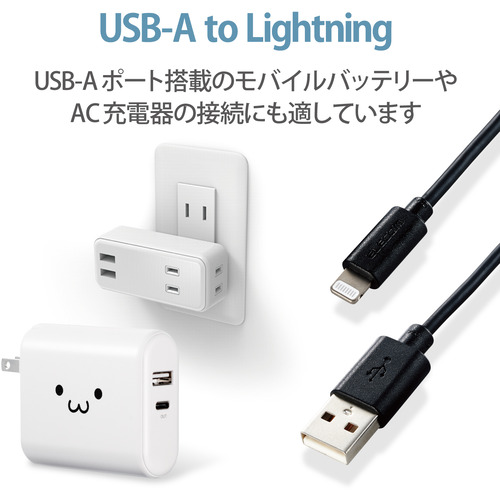 ●iPhoneやiPod、iPadなどのLightningコネクタ搭載機器とUSB-A端子を搭載しているパソコンを接続し、充電・データ通信が可能なLightningケーブルです。