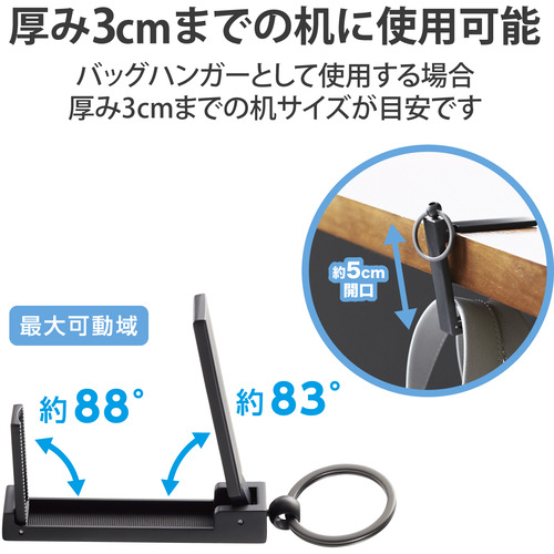 ●折りたたんでコンパクトに持ち運びでき、出先でも鞄を床置きしないバッグハンガー機能付きのスマートフォン用コンパクトスタンドです。