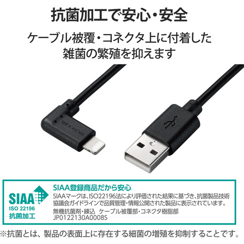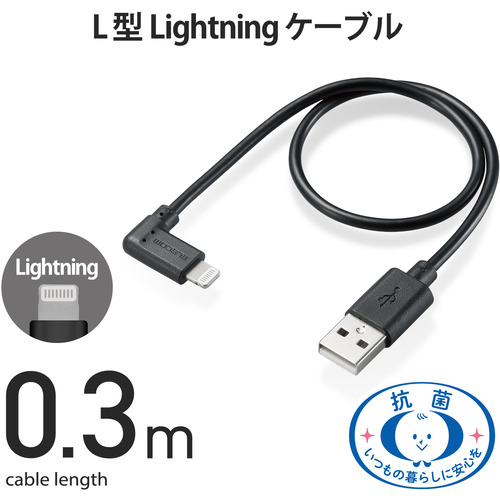 エレコム MPA-UALL03BK Lightningケーブル L字コネクタ 抗菌 0.3m ブラック