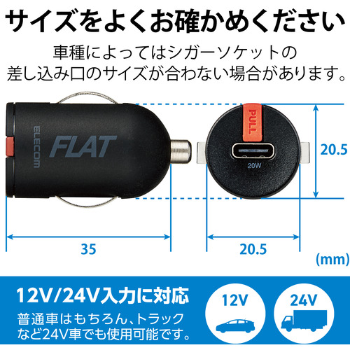 USB Power Delivery規格に準拠し、最大20W出力でスマートフォンやタブレットを超高速充電できるシガーチャージャー“FLATシリーズ”。