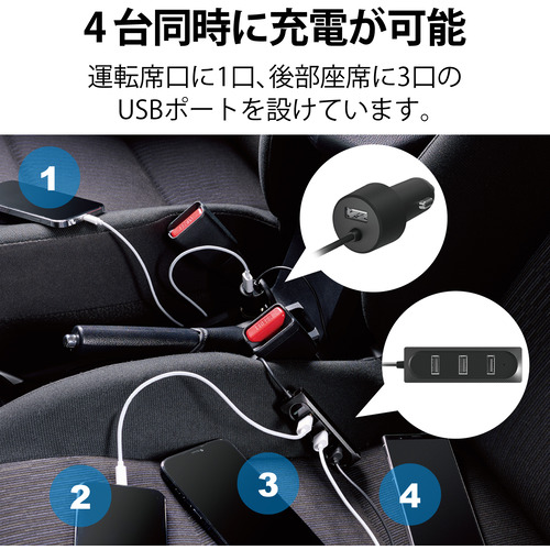 エレコム MPA-CCU17BK シガーチャージャー 後部座席用 36W USB-A4ポート 2.0m ブラック