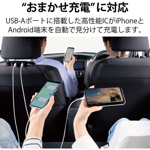 ●USBポートに搭載した高性能ICがiPhoneとAndroid端末を自動で見分けて、最適な出力で充電できる「おまかせ充電」に対応しています。