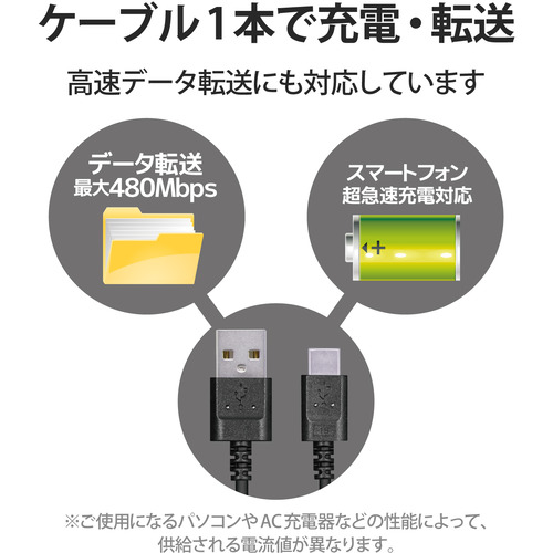 ●USB-Aを搭載しているパソコン及び充電器、モバイルバッテリーなどに、USB Type-C(TM)を搭載しているスマートフォンやタブレットを接続し、充電やデータ転送ができるUSB2.0ケーブルです。