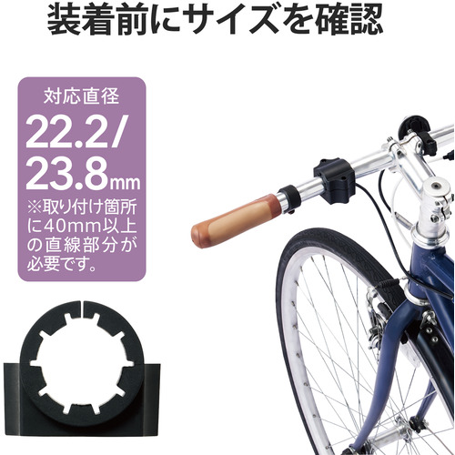 ●22.2mm、23.8mmのハンドルパイプ径に取り付け可能です。※取り付け箇所に40mm以上の直線部分が必要です。