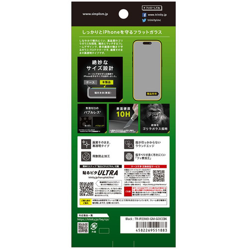 トリニティ TR-IP23M3-GM-GOCCBK iPhone 15Pro/iPhone 14Pro ゴリラガラス 高透明 フレームガラス ブラック