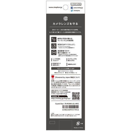 ・カメラレンズを保護・ワンランク上の高透明、ARコーティング加工・高透明で撮影に影響なし・日本メーカー、AGC社製の強化ガラス採用・気泡ゼロの「バブルレス」仕様・表面硬度10Hで傷から徹底ガード・飛散防止加工・防指紋加工で清潔を保つ・フラッシュ対応・マイクロファイバークロス付属・貼り付けサポートツール「補助シール」「ピック」付属
