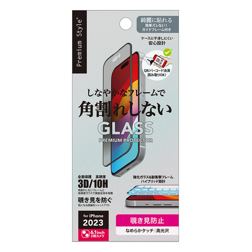 PGA PG-23AGLF05MB iPhone15 ガイドフレーム付 液晶全面保護ガラス 角割れ防止PETフレーム Premium Style 覗き見防止 PG23AGLF05MB