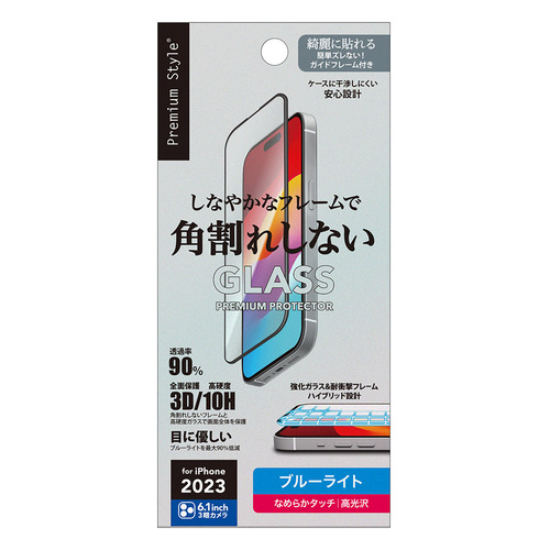PGA PG-23BGLF03BL iPhone15 Pro ガイドフレーム付 液晶全面保護ガラス 角割れ防止PETフレーム Premium Style ブルーライト低減/光沢 PG23BGLF03BL