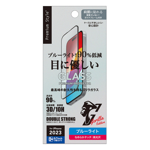 PGA PG-23BGLG03BL iPhone15 Pro ガイドフレーム付 液晶全面保護ガラス 2度強化/ゴリラガラス Premium Style ブルーライト低減/光沢 PG23BGLG03BL