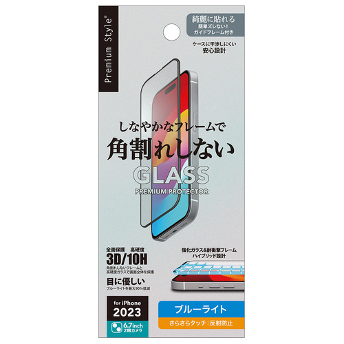 PGA PG-23CGLF04BL iPhone15 Plus ガイドフレーム付 液晶全面保護ガラス 角割れ防止PETフレーム Premium Style ブルーライト低減/アンチグレア PG23CGLF04BL