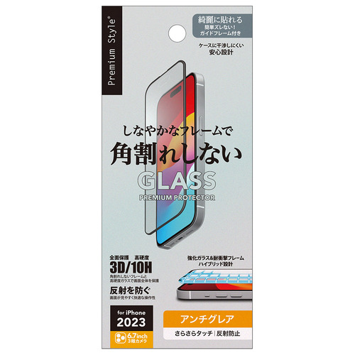 PGA PG-23DGLF02AG iPhone15 Pro Max ガイドフレーム付 液晶全面保護ガラス 角割れ防止PETフレーム Premium Style アンチグレア PG23DGLF02AG