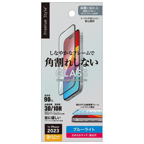 PGA PG-23DGLF03BL iPhone15 Pro Max ガイドフレーム付 液晶全面保護ガラス 角割れ防止PETフレーム Premium Style ブルーライト低減/光沢 PG23DGLF03BL