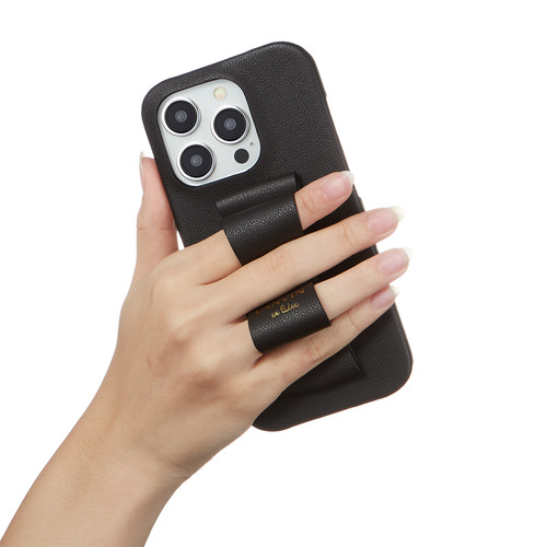 ●ケースの背面にあるリボンに指を通すとスマホリングのように使用でき、手から落下する心配がありません。