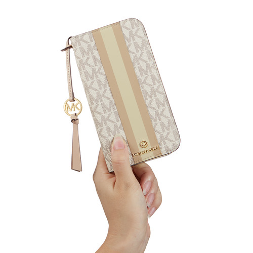 ●MKシグネチャーのロゴプリントキャンバスに、ストライプをあしらったデザインが特徴のブックタイプのスマホケース です。