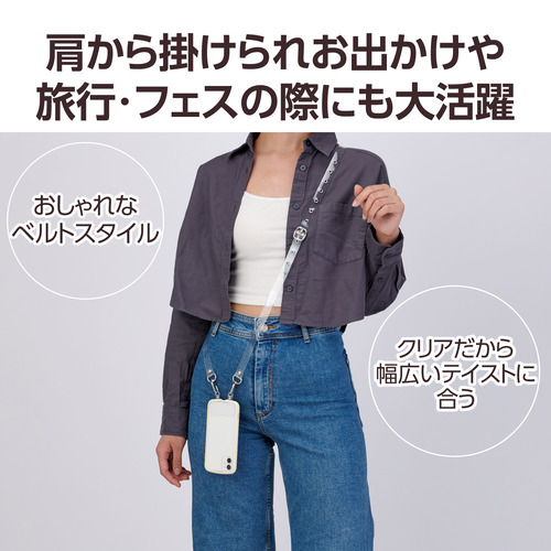 ●肩から掛けられるクリアタイプのスマホショルダーストラップです。両手があいて、普段のお出かけはもちろん、旅行やフェスなどのイベント時にも活躍。落下、盗難、紛失防止にもなります。クリアタイプなのでコーディネートの邪魔をせず、幅広いテイストの着こなしに合わせられます。