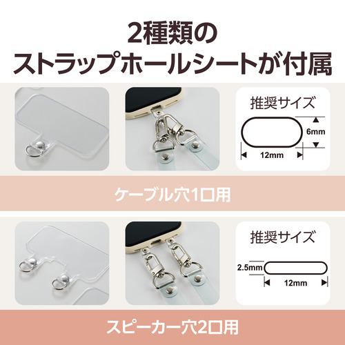 ●ケースにストラップホールがなくても、付属のストラップシート(透明)をスマートフォンとケースの間に挟むだけで使用でき、取り外しも簡単です。