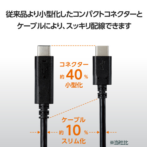●最大100WのUSB Power Deliveryに対応したUSB2.0 Type-C(TM)ケーブルです。従来品より約40%小型化(※当社比)したコンパクトコネクターとスリムケーブルによりスッキリ配線できます。