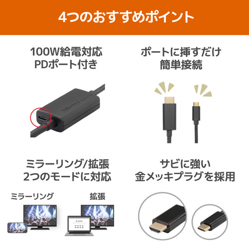 本製品は、USB Type-Cポートからテレビやディスプレイに出力可能なUSB Type-C to HDMI変換ケーブルです。USB Type-Cポートを使用するため、スマートフォンの他、HDMIポートが少ないノートPCでも手軽にマルチディスプレイ化が可能です。4K60Hz出力にも対応しており、ミラーリング/拡張どちらかを選んで使用することができます。※4K映像を出力する際は、本体、ディスプレイのすべてが4Kに対応している必要があります。※保護されたコンテンツの再生をすべて保証するものではありません。