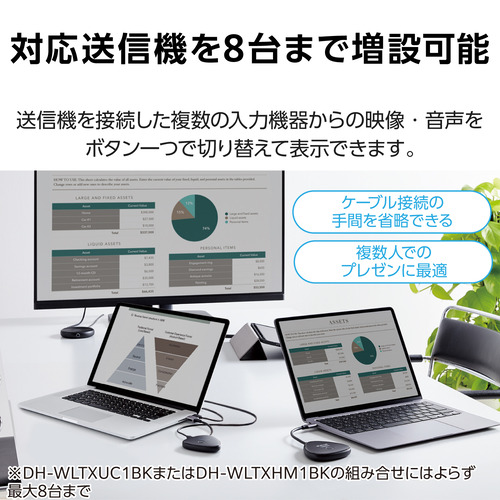 ●最大8台までの送信機をペアリングして増設できます。(DH-WLTXUC1BKまたはDH-WLTXHM1BKのワイヤレスHDMIエクステンダーの送信機の組み合せにはよらず最大8台まで)