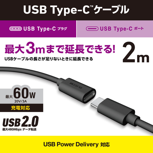 エレコム MPA-ECC20BK USB Type-C延長ケーブル USB2.0 2.0m