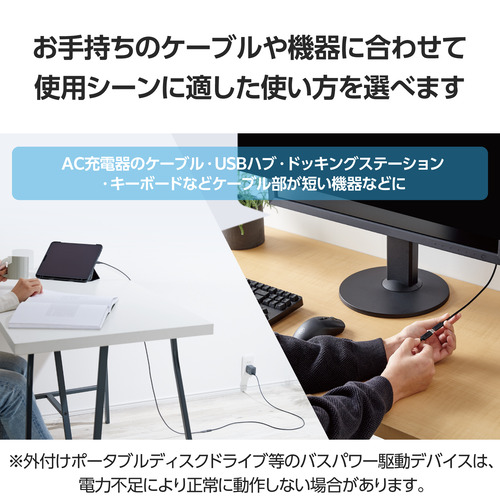 ●ケーブル一体型のAC充電器のケーブル長を延長して使用できるほか、USBハブやドッキングステーション、キーボードなどケーブル部が短い機器にも使えるため、パソコンから離れた位置での接続も可能になります。